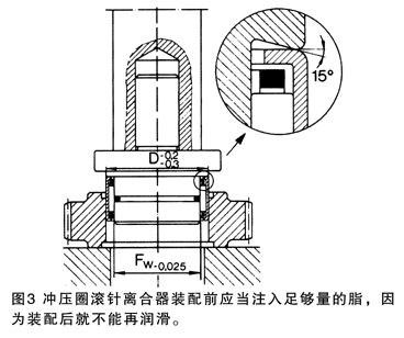 安装时轴和座孔应具有15°倒角,才能达到最好的安装条件,安装方法如图3。只有装入座孔后,滚针和离合器的薄壁冲压外圈方可获得其同心的轮廓,无需任何另外的轴向定位。安装公差与冲压外圈滚针轴承相同,见表1。座孔表面粗糙度为Ra0.8。 |