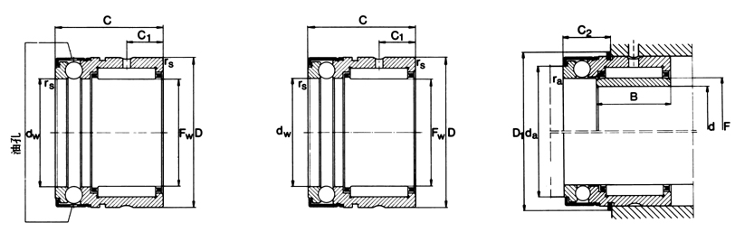 润滑,允许值勤为表中数值的60%。3)内圈和止动环必须分别地订购。4)如两轴承要调至最小的中心距,其止动环必须缩短。
